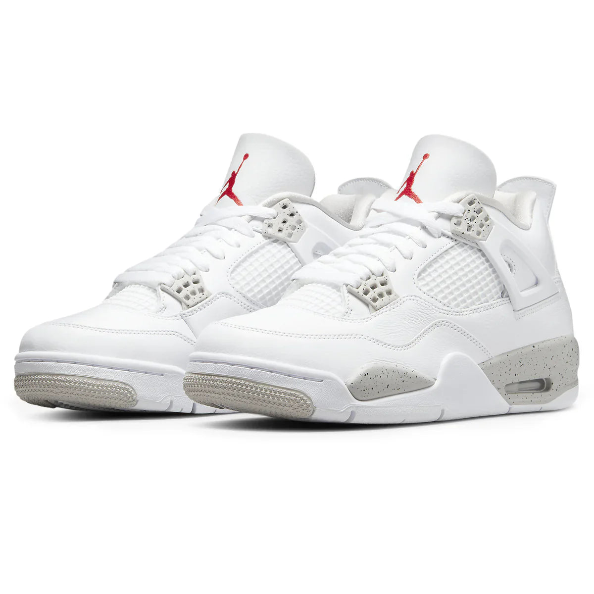 The Air Jordan 4 Retro ‘White Oreo’ features a design theme that recalls the original ‘Oreo’ AJ4 from 1999. The black tumbled leather upper of the older shoe is replaced by a clean white finish, though the speckled molded eyelets in Tech Grey remain the same. The neutral hue is repeated on the Jumpman heel logo and polyurethane midsole, featuring encapsulated Air cushioning in the forefoot and a visible unit under the heel. A second Jumpman adorns the tongue in a contrasting pop of Fire Red.