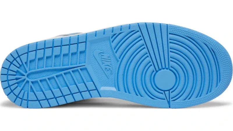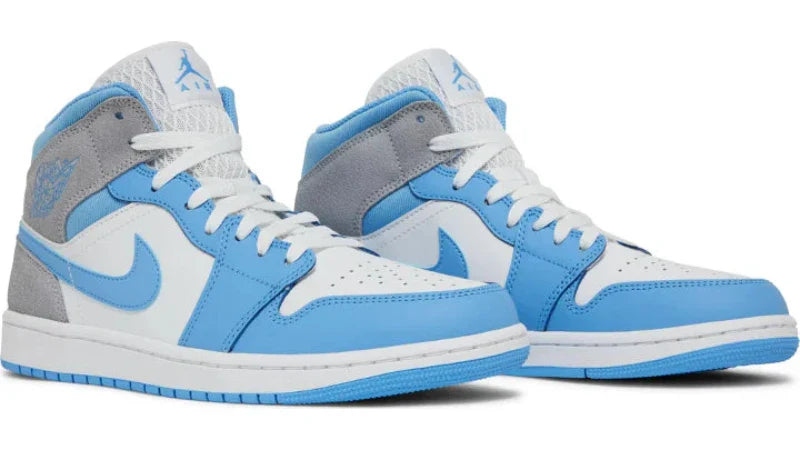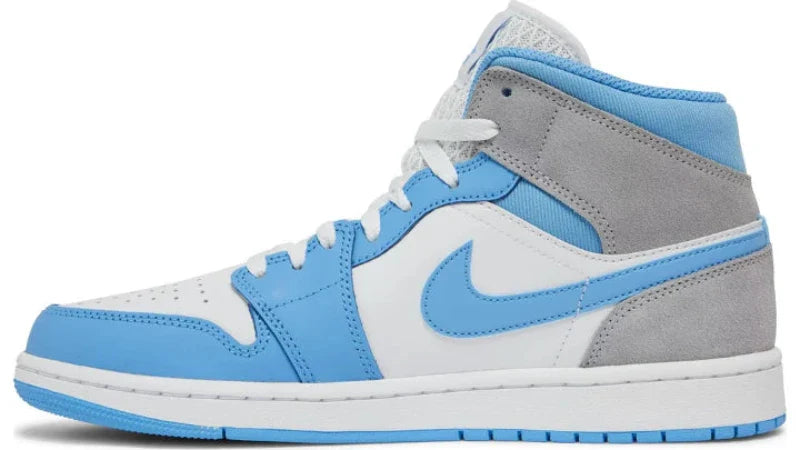 The Air Jordan 1 Mid 'University Blue Grey' has a blue outsole, white midsole, and then matching panelling on the upper. The toe cap, eyelets, Swooshes and ankle are painted in blue, with the ankle coming in a canvas material rather than the leather, whilst the heel and Wings panelling come in a grey suede.